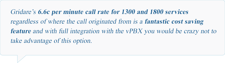 Gridare is able to provide you with 1300 local call and 1800 free call from anywhere in Australia numbers. Gridare can also transfer existing 1300 and 1800 numbers for you with a once off porting fee of $66. These services are easy to integrate into your Gridare Internet Telephony system and can be customized using the features of Gridare PBX.